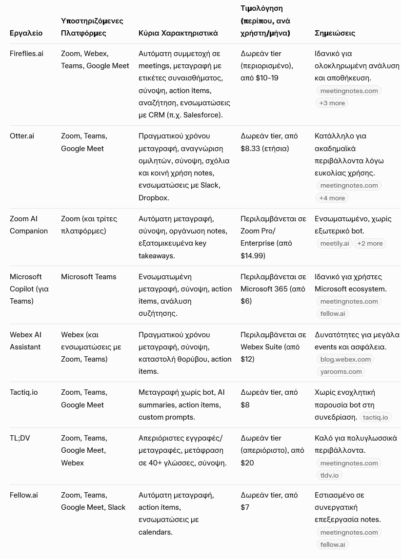 Η ειρωνεία είναι ότι, ενώ τα προηγούμενα χρόνια 130 χρόνια η τήρηση αναλυτικών πρακτικών ήταν δυσχερής, τώρα που έγινε πανεύκολη τη σταμάτησαν. Πλέον, προσφέρεται τεχνικά η δυνατότητα τήρησης και βιντεοσκοπημένων πρακτικών (πολύ περισσότερο αφού οι συνεδριάσεις γίνονται μέσω διαδικτυακών εφαρμογών και όχι διά ζώσης) αλλά και αυτόματης μεταγραφής προφορικού λόγου σε κείμενο. Παρακάτω δίνω έναν πίνακα εργαλείων Τεχνητής Νοημοσύνης (ΑΙ) που κάνουν αυτή τη δουλειά με ευτελές αντίτιμο. (Πίνακας φτιαγμένος απ’ το Grok της xAI – με δεδομένα και ανάλυση δικά του).